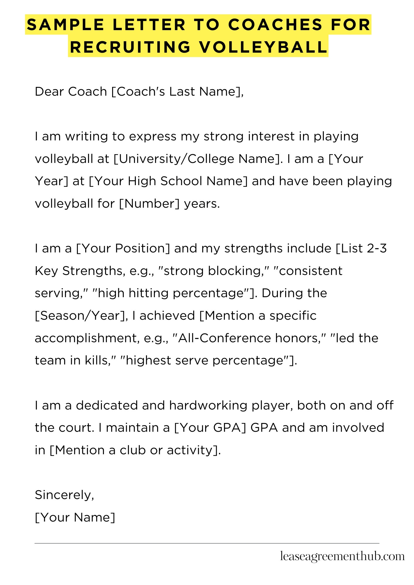 A “Sample Letter To Coaches For Recruiting Volleyball” is a template. It helps aspiring volleyball players connect with college coaches. Players use it to express interest in a program. They also highlight their skills and achievements. It’s often needed when a player wants to play college volleyball.