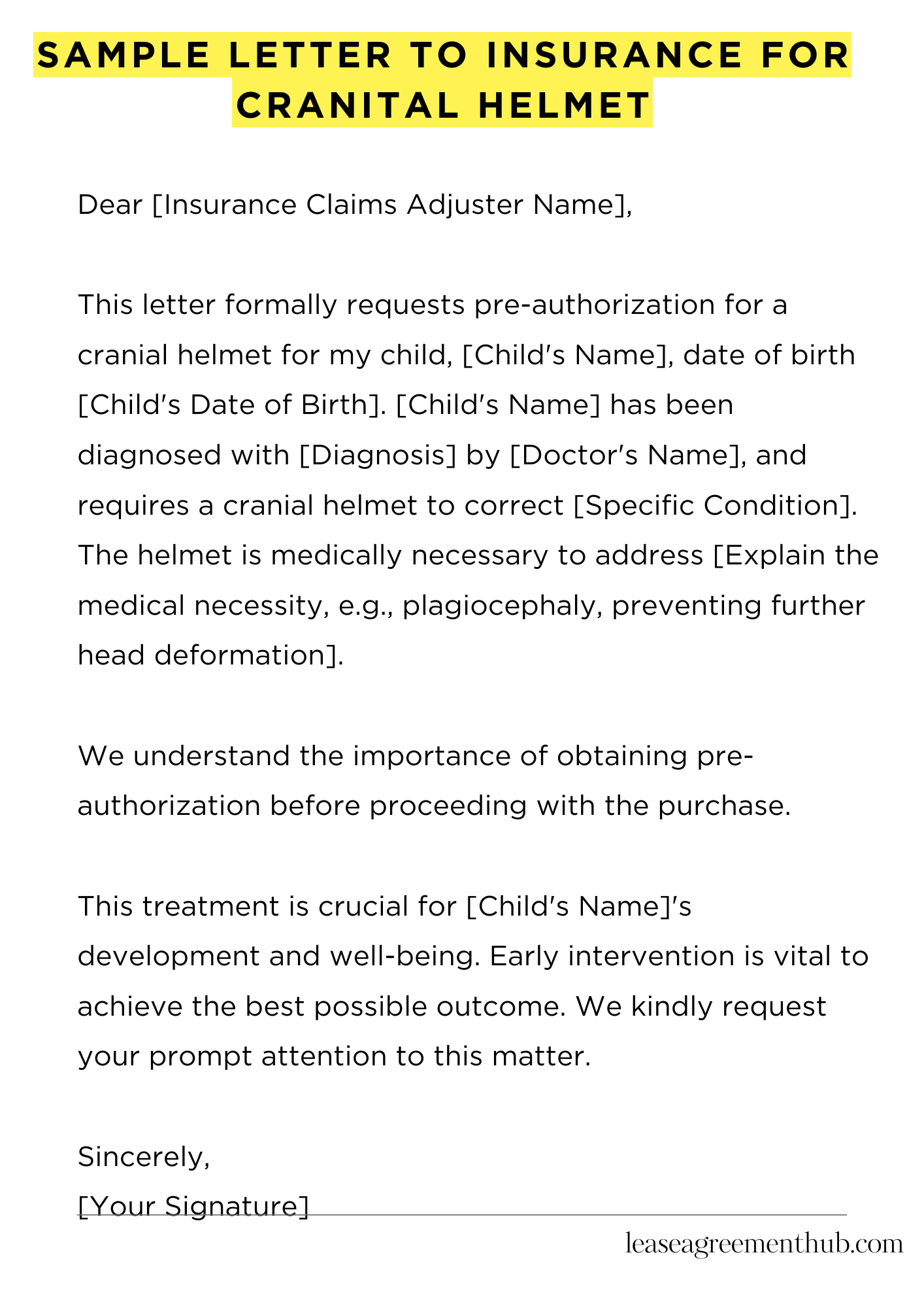 A sample letter to your insurance company requests coverage for a cranial helmet. It’s crucial for getting approval.