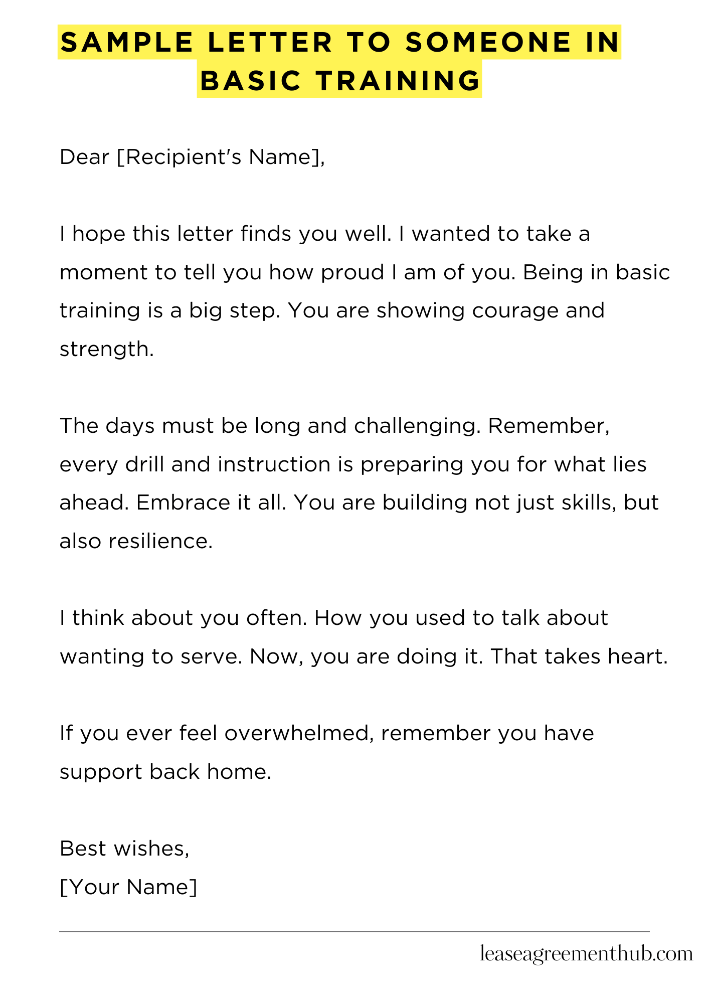 I hope this letter finds you well. I wanted to take a moment to tell you how proud I am of you. Being in basic training is a big step. You are showing courage and strength.